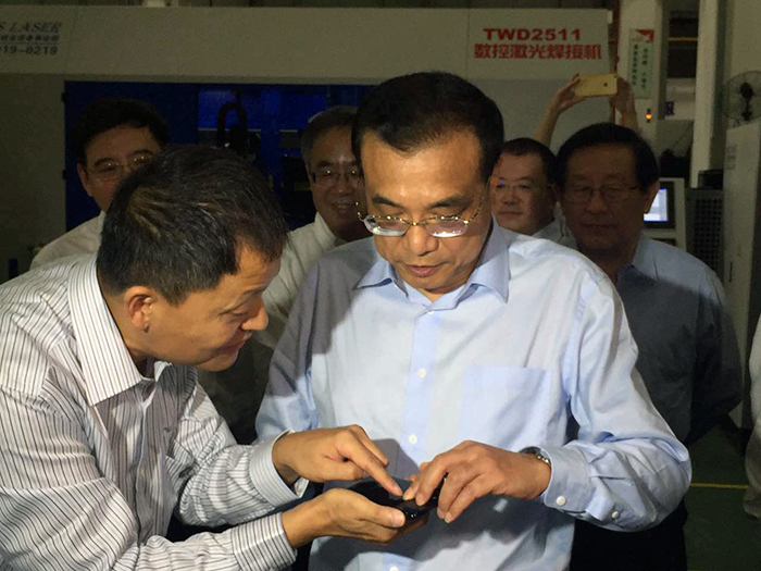 大族激光董事長高云峰、大族激光鈑金裝備事業部總經理陳燚、總工程師陳根余等領導向總理匯報了公司的運營情況,激光技術原理與應用,總理現場視察了大族激光鈑金裝備事業部激光切割、焊接設備生產車間和3D打印復合加工中心及數控系統,觀看了激光制造裝備在軌道交通、汽車制造、工程機械等工業領域應用的演示視頻。總理期間停步10多次,問得特別仔細,近乎參觀了所有設備。