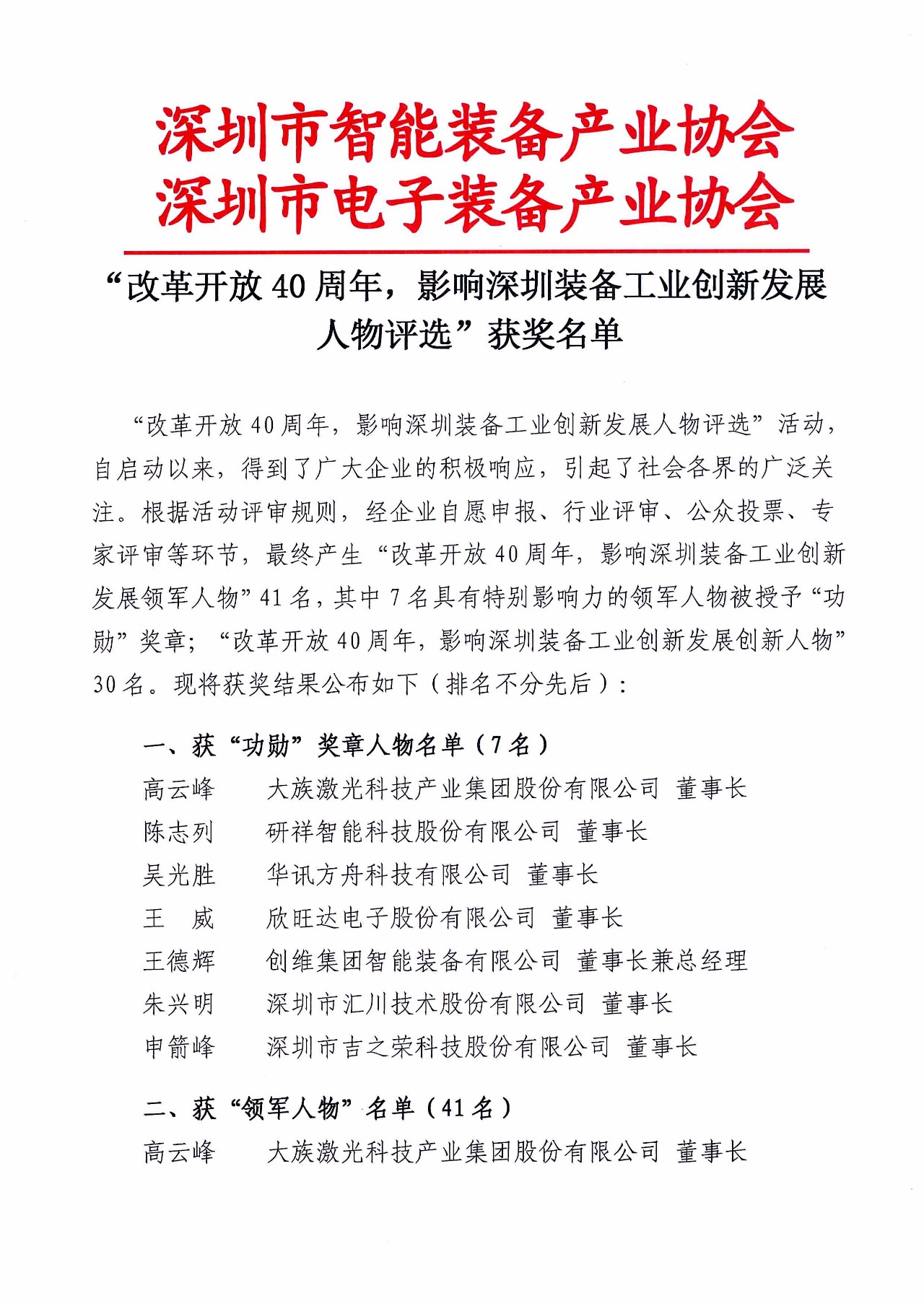 為表彰歷年來(lái)為深圳裝備制造行業(yè)做出顯著貢獻(xiàn)的先鋒模范,深圳市智能裝備產(chǎn)業(yè)協(xié)會(huì)、深圳市電子裝備產(chǎn)業(yè)協(xié)會(huì)聯(lián)手深圳商報(bào)共同主辦“改革開放40周年,影響深圳裝備工業(yè)創(chuàng)新發(fā)展人物”評(píng)選活動(dòng)。