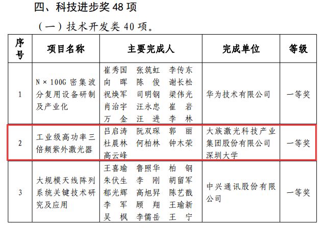在科技進步獎名單中,大族激光科技產業集團股份有限公司(以下簡稱:大族激光)與深圳大學合作科研項目:工業級高功率三倍頻紫外激光器名列其中。