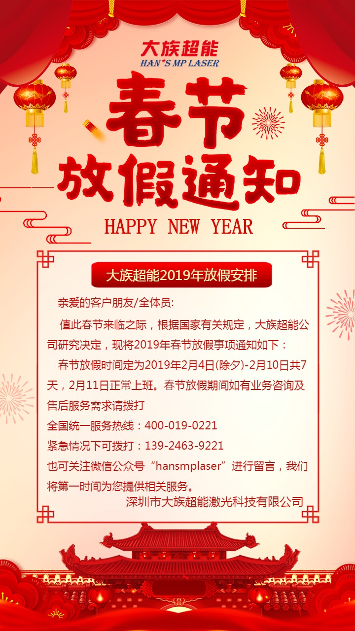 值此春節來臨之際,根據國家有關規定,大族超能公司研究決定,現將2019年春節放假事項通知如下: