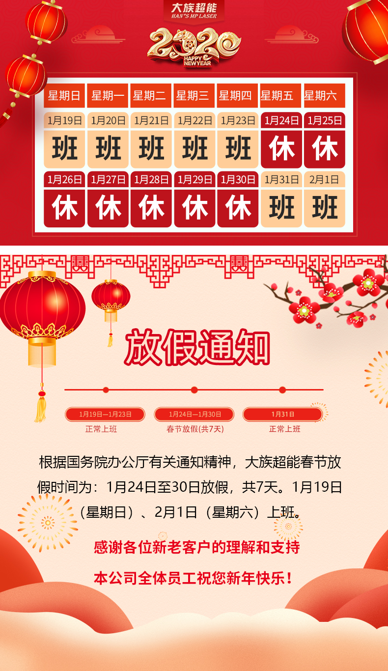 爆竹聲聲辭舊歲,紅梅朵朵迎新春。在繁忙的工作中,我們即將迎來2020農(nóng)歷新年!借此機(jī)會,大族超能祝您及您的家人在新的一年身體健康、萬事如意、闔家幸福!根據(jù)國務(wù)院辦公廳有關(guān)通知精神,大族超能春節(jié)放假時間為:1月24日至30日放假,共7天。1月19日(星期日)、2月1日(星期六)上班。